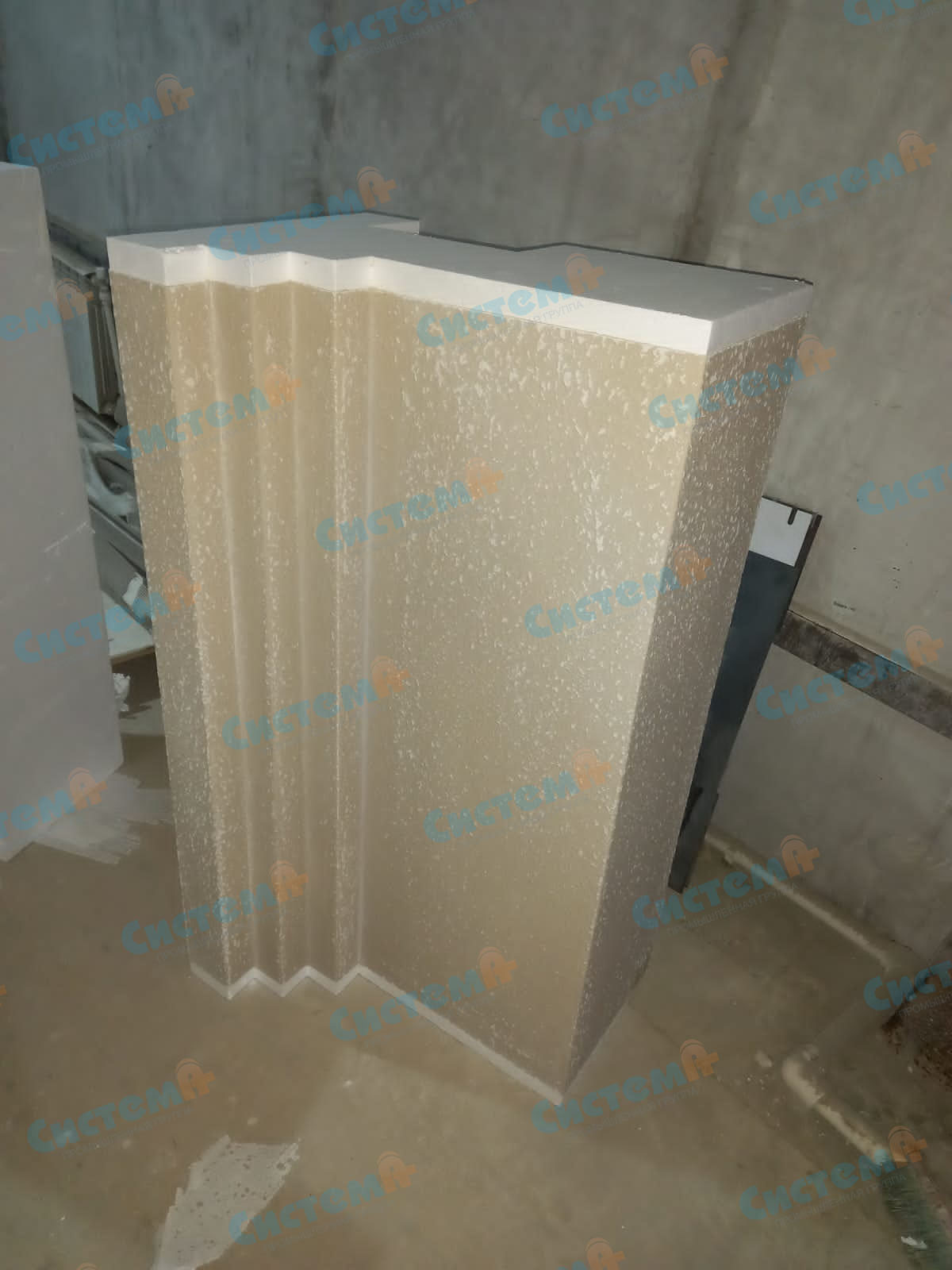Когда чертеж был готов, приступили к обработке пенополистирола методом контурной резки. Эту высокопроизводительную и бюджетную технологию производства выбрали для обеспечения высокой скорости обработки. Помимо того, что пенопласт прост в обработке, он обладает и другими преимуществами. Среди них предельно малый вес из-за вспененной структуры, хорошие показатели теплоизоляции и звукоизоляции, устойчивость к воздействию плесени, бактерий и других микроорганизмов, влагостойкость. Готовая лепнина легко устанавливается на фасад, выглядит эстетично – поверхность с расстояния практически неотличима от каменной, а срок службы составляет несколько десятков лет.